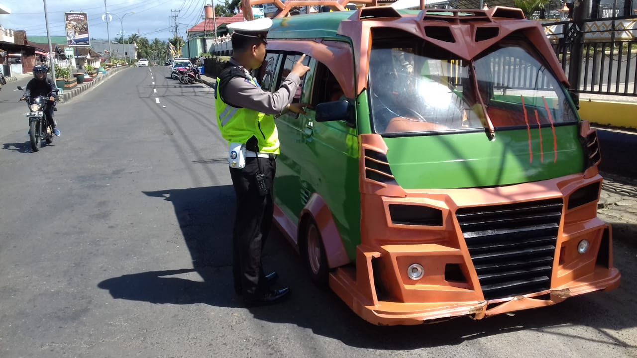 KOTAAGUNG – Satuan Lalu Lintas Polres Tanggamus menindak 3 angkutan umum jurusan Kota Agung – Wonosobo di simpang lampu merah Kota Agung Tanggamus dalam razia pencegahan penumpang naik di atas kap mobil.