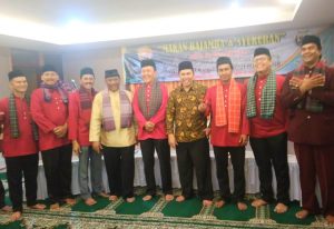 PENGURUS. Ketua KBSB Provinsi Lampung, Prof Faisal (tengah berpeci dan sarung hitam) dan Ketua Panitian KBSB Emas Khaidarmansyah (baju kuning muda) berpose bersama segenap pengurus.