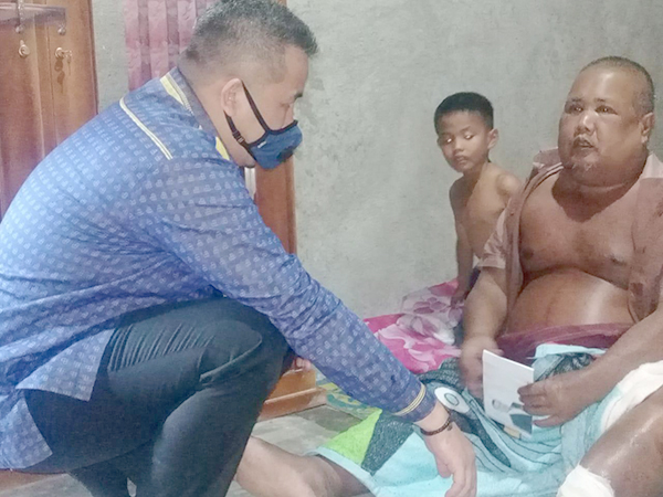 PESAWARAN -Calon bupati Kabupaten Pesawaran Dendi Ramadhona mengunjungi Saparudin (48) warga Dusun Penengahan, Desa Gedongtataan, Kabupaten Pesawaran, yang sekujur tubuhnya mengalami pembengkakan akibat penyakit komplikasi jantung dan juga gula darah, Senin (28/09/2020).